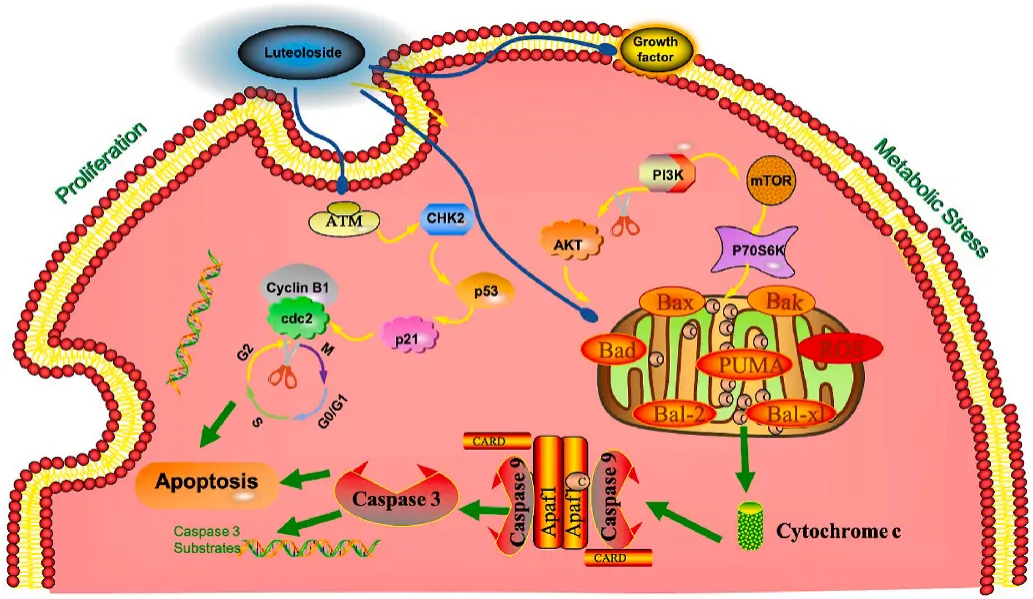 3.結(jié)直腸癌:木犀草苷通過雙重機(jī)制(線粒體凋亡通路激活和PI3K/AKT/mTOR通路抑制)抑制HCT116細(xì)胞增殖并誘導(dǎo)凋亡,其IC50為44.1μM,可作為功能性膳食成分或個(gè)性化營養(yǎng)治療的潛在候選物,為結(jié)直腸癌的天然藥物開發(fā)提供理論依據(jù)。[7]