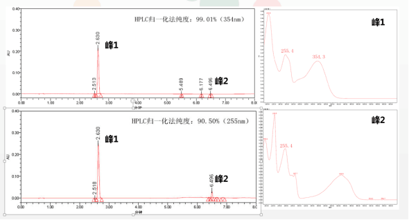 解決方案:選擇對照品與雜質具有相似吸收特征的波長,純度結果會更趨近真實值(如示圖選擇255nm檢測)。