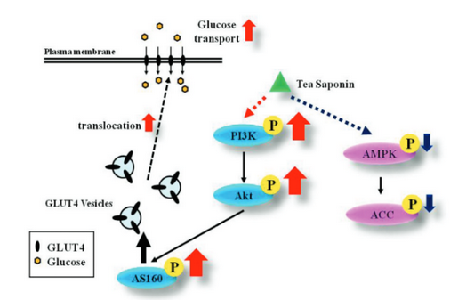 2、抗糖尿病作用:茶皂素E1通過(guò)激活PI3K/Akt/mTOR信號(hào)通路,增加C2C12成肌細(xì)胞的葡萄糖攝取能力,改善肌肉能量代謝,降低血糖水平,對(duì)于Ⅱ型糖尿病具有潛在的治療作用。