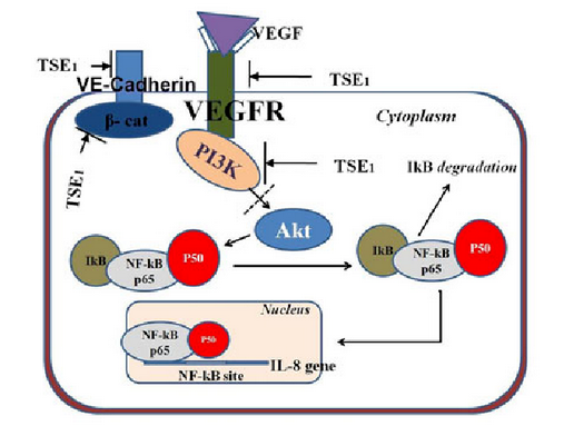 圖3 茶皂素E1抗血管生成作用的可能信號(hào)通路,從VEGFR-2、β-catenin、PI3-K到NF-κB[3]