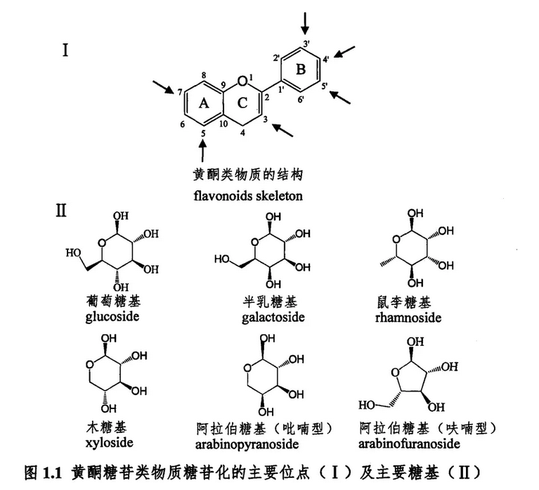 黃酮糖苷主要是由黃酮基本骨架主要位置上的氧化作用所形成的。糖取代基多以氫氧化形式與黃酮碳骨架相連,形成O-糖苷,也有少數(shù)與黃酮A環(huán)上的C原子直接相連形成C-糖苷,如牡荊素、葛根素等。糖基主要包括葡萄糖、半乳糖、鼠李糖、木糖、阿拉伯糖等,且部分糖基有乙?;?、咖啡?;?、香豆?;?、沒食子?;痊F(xiàn)象。