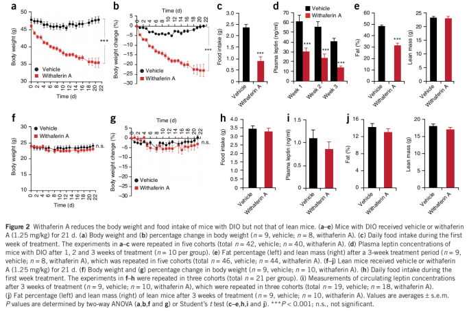 醉茄素A通過增強(qiáng)瘦素(leptin)敏感性顯著改善飲食誘導(dǎo)肥胖(DIO)小鼠的代謝異常(圖6)。此外,醉茄素A獨立于瘦素增敏作用,直接改善葡萄糖代謝。為開發(fā)新型抗肥胖藥物提供了新思路,具備臨床轉(zhuǎn)化潛力。[5]