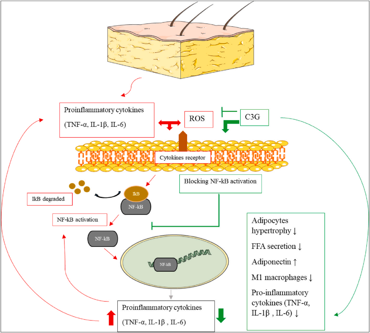 圖1 矢車菊素-3-O-葡萄糖苷(C3G)作為抗炎劑的作用機(jī)制[9]