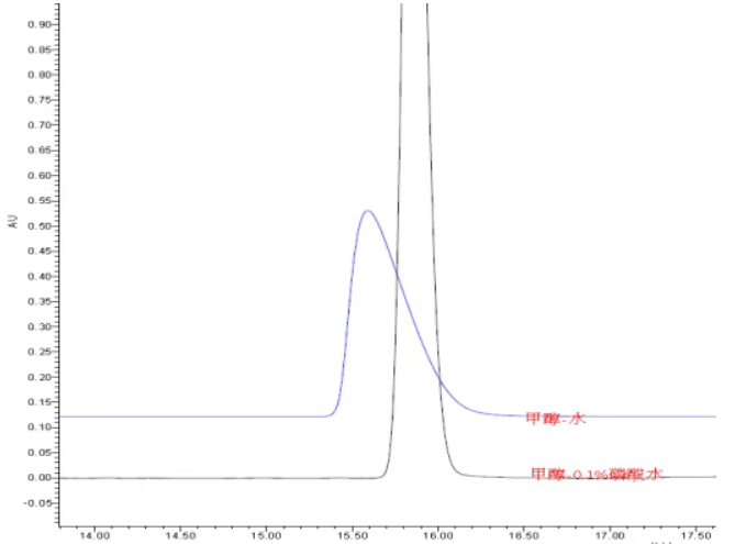 原因:當(dāng)pH值不適當(dāng)時(shí),對照品與固定相的相互作用不均勻,導(dǎo)致部分分子提前或延遲流出,形成前沿峰或拖尾峰。