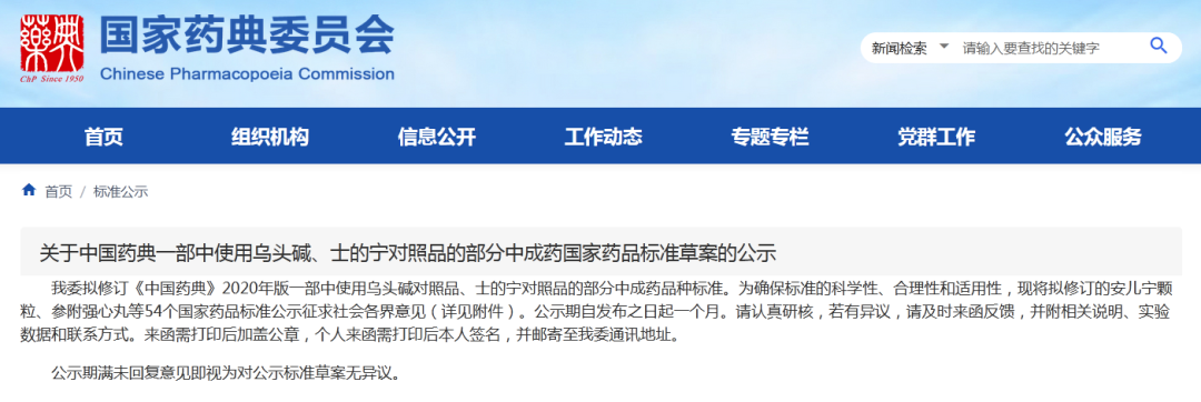 重磅更新丨國家藥典委員會擬修訂《中國藥典》2020年版一部中使用烏頭堿對照品、士的寧對照品的54個中成藥品種標準